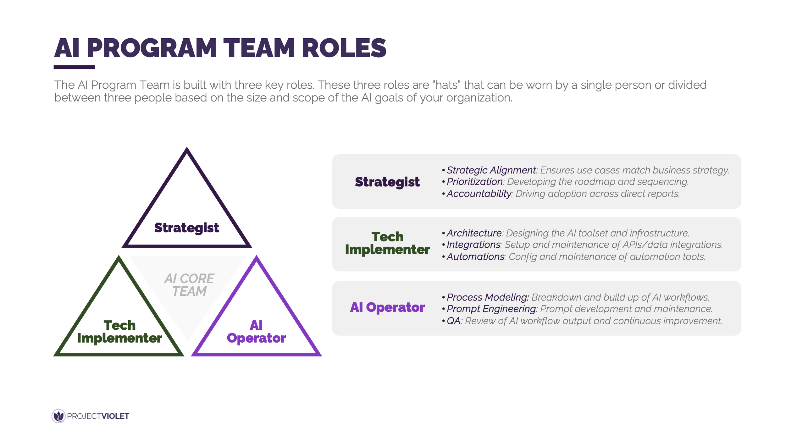 High-performing AI programs work because strategic intent, technical enablement, and operational execution are clearly owned and deliberately connected. The strategist sets direction by aligning AI initiatives to business priorities, sequencing the roadmap, and driving accountability for adoption. The tech implementer focuses on architecture, integrations, and automation reliability to ensure solutions can scale. The AI operator brings these efforts to life by designing workflows, maintaining prompts, and continuously improving quality through hands-on execution and review.