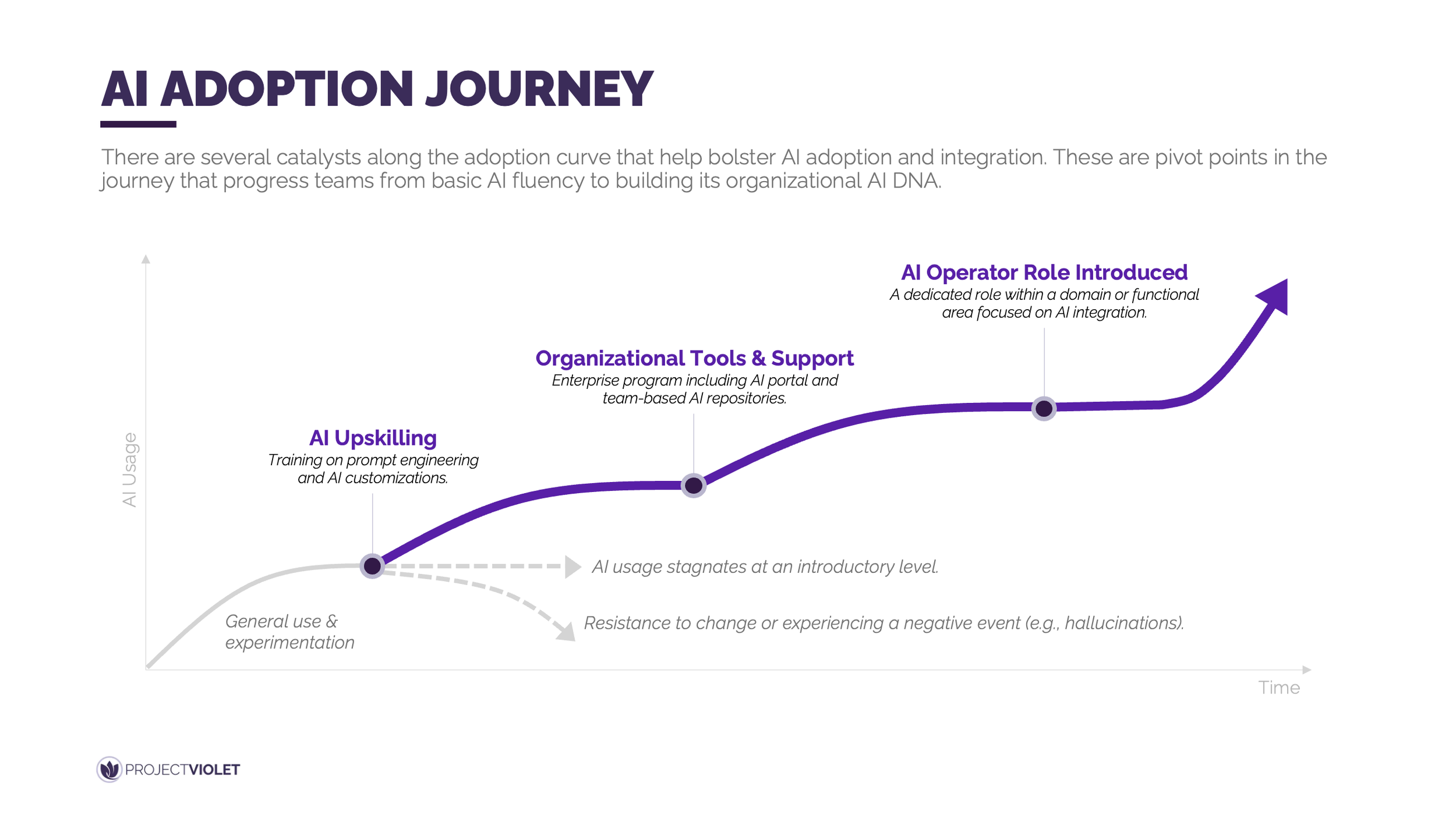 AI adoption typically begins with general experimentation and early productivity gains, followed by a plateau where usage stalls at a basic level. Moving beyond this point requires intentional catalysts that shift AI from a personal tool to an organizational capability.