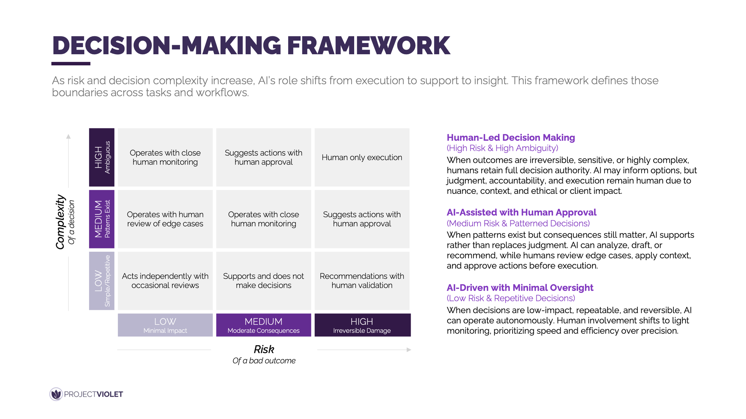 This framework provides shared guidance for how AI should be used across different types of work based on risk and decision complexity. As potential impact increases, AI’s role intentionally shifts from execution to support to insight.
