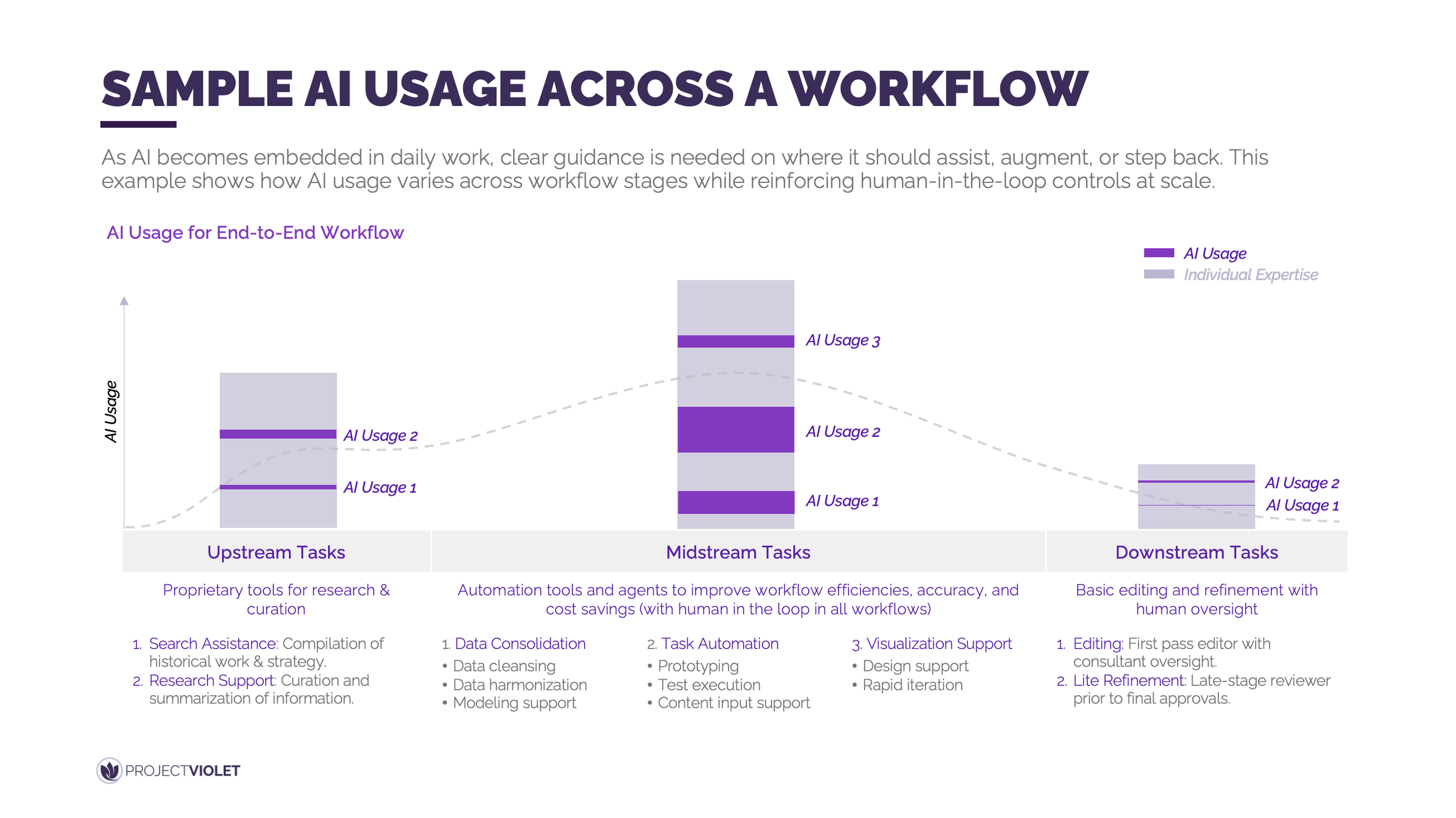 The intent is to move from abstract guidance to concrete, role-specific examples that help teams apply judgment consistently. By mapping AI usage across upstream, midstream, and downstream tasks, organizations can clarify where AI adds leverage and where human expertise must remain dominant. In early stages, AI can support research, information curation, and pattern discovery with relatively low risk. In the middle of the workflow, AI often plays its most powerful role by supporting automation, analysis, and iterative development, while maintaining clear human-in-the-loop controls. As work approaches final outputs and approvals, AI use intentionally tapers, shifting toward light editing and refinement under direct human oversight.